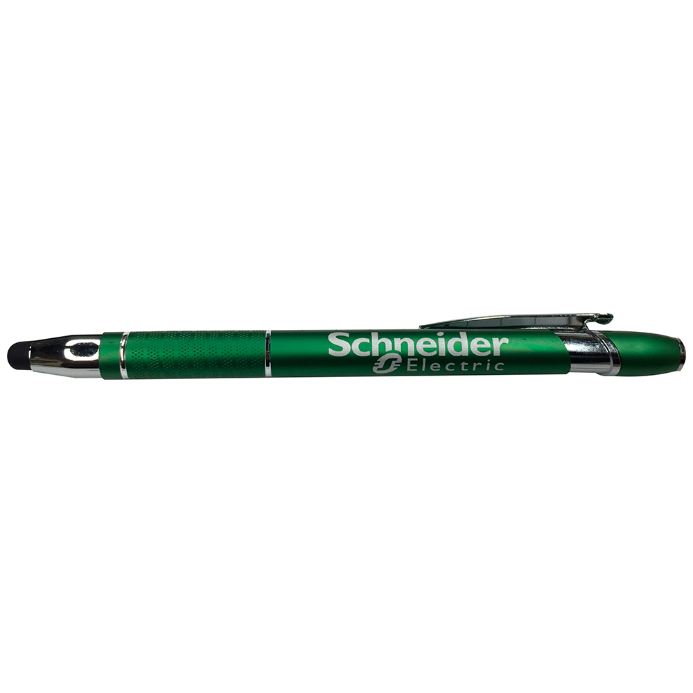 Click-action ballpoint pen with soft rubber stylus for touch-screen devices.