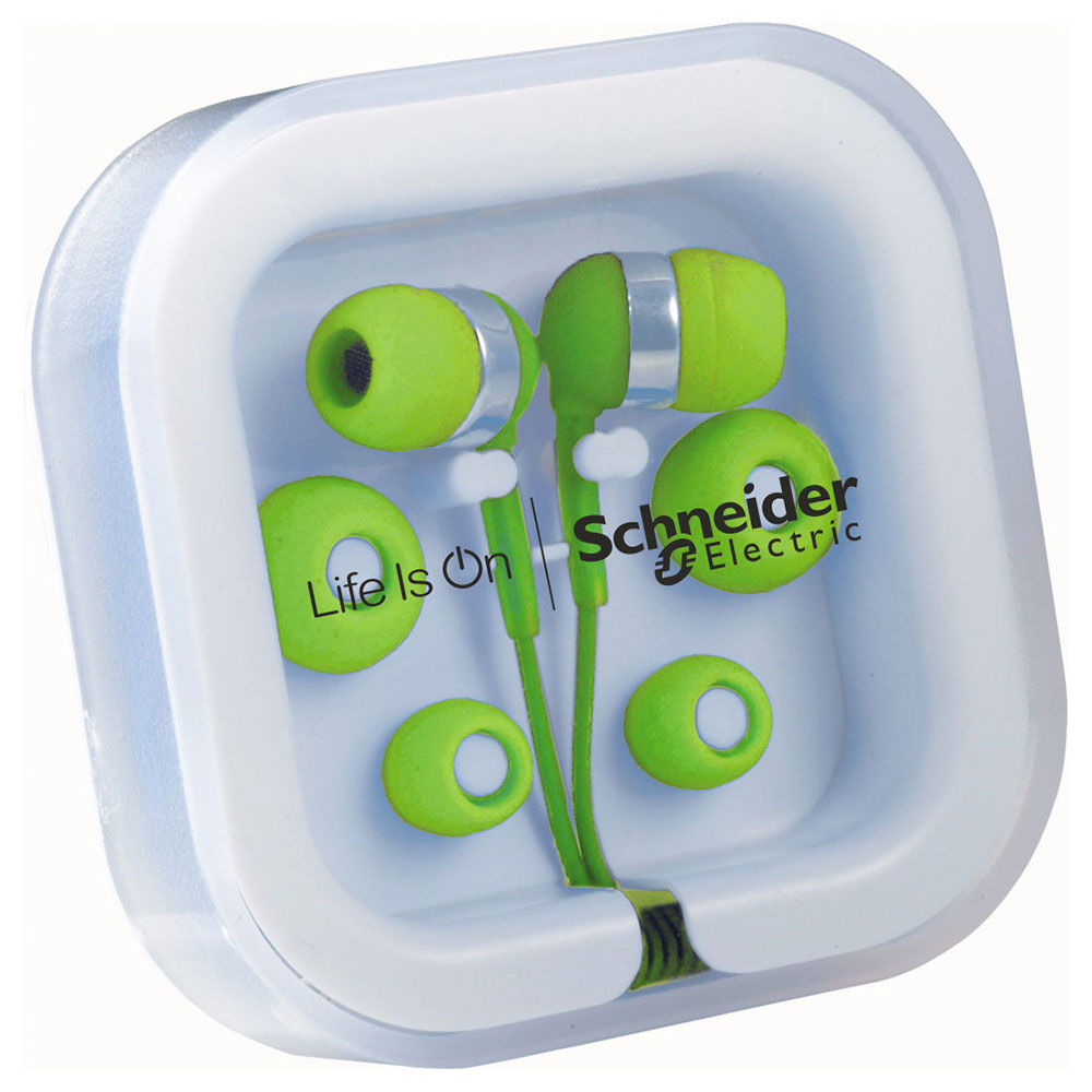 Earbuds w/Microphone are a deluxe earbud set that includes a built-in cable microphone that allows you to go hands free with your media device. Easily answer or end a call with a single button on the microphone. This set also includes three interchangeable soft rubber earbud covers, a plastic case with cable storage, a standard 3.5mm audio jack and a 38- inch earbud cable.